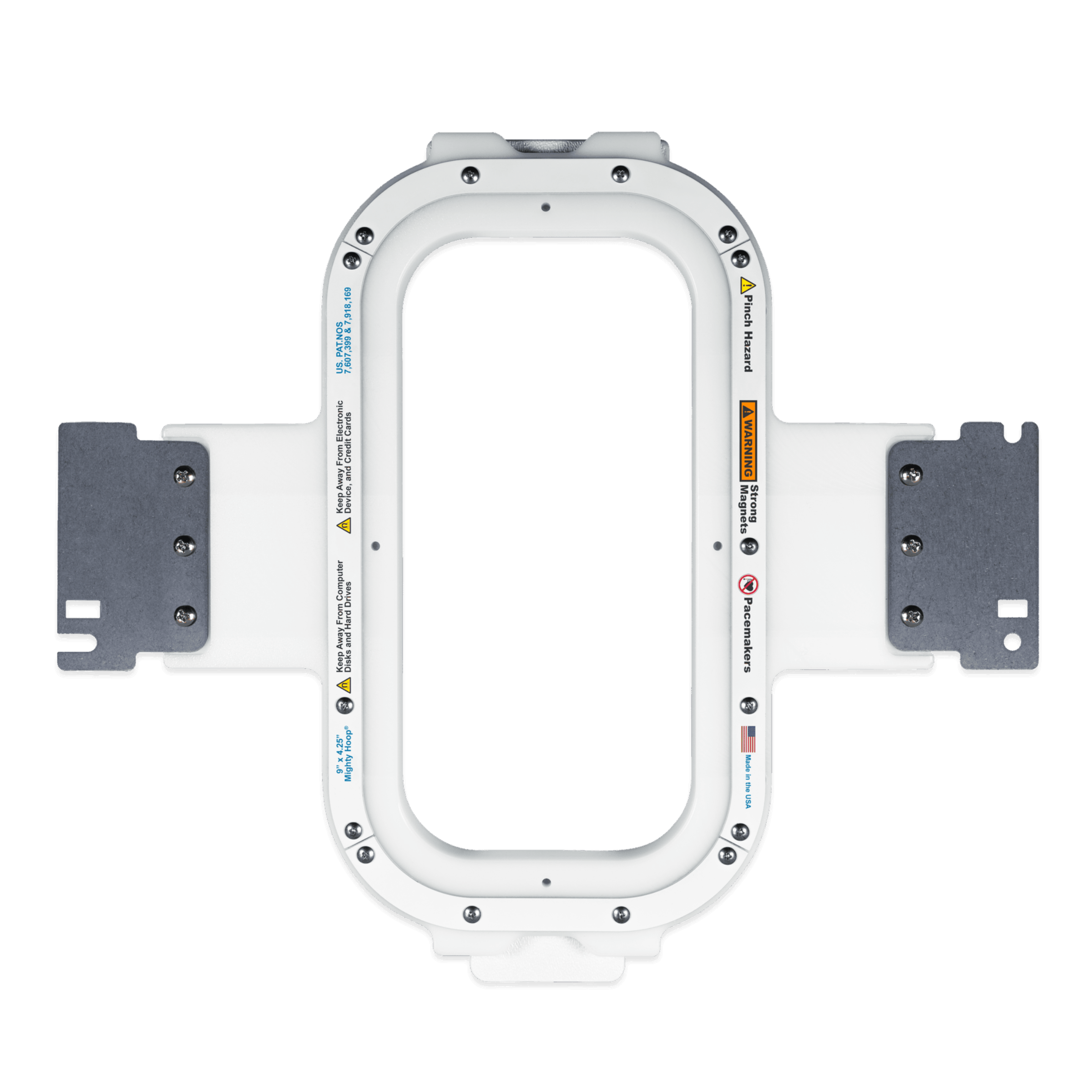 Reelt sømområde er ca. 8.8 x20.5 cm.Magnetrammer er et hjelpemiddel for å gjøre innspenningen enklere.